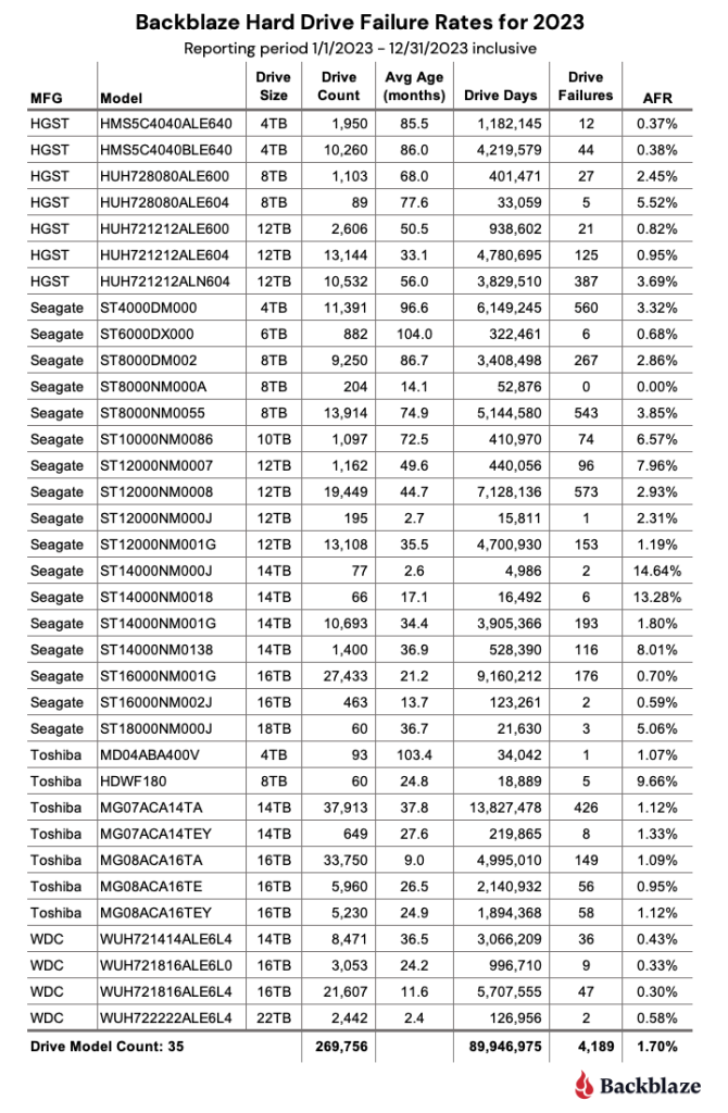 What’s missing?: As noted, a drive model required 200,000 drive days or more in 2023 to make the list. Drives like the 22TB WDC model with 126,956 drive days and the 8TB Seagate with zero failures, but only 52,876 drive days didn’t qualify. Why 200,000? Each quarter we use 50,000 drive days as the minimum number to qualify as statistically relevant. It’s not a perfect metric, but it minimizes the volatility sometimes associated with drive models with a lower number of drive days.