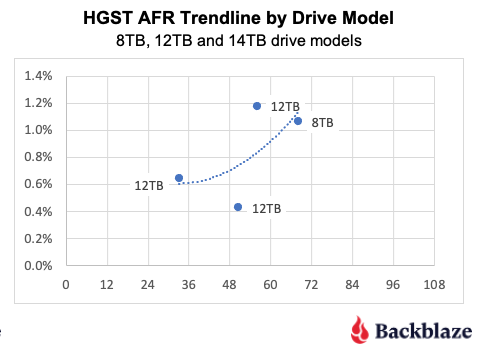 Interestingly, the trendline for the two charts is basically the same up to the six year point. If we attempt to project past that for the 8TB and 12TB drives there is no clear direction. Muddying things up even more is the fact that the three models we removed because they are older than seven years are all consumer drive models, while the remaining drive models are all enterprise drive models. Will that make a difference in the failure rates of the enterprise drive model when they get to seven or eight or even nine years of service? Stay tuned.