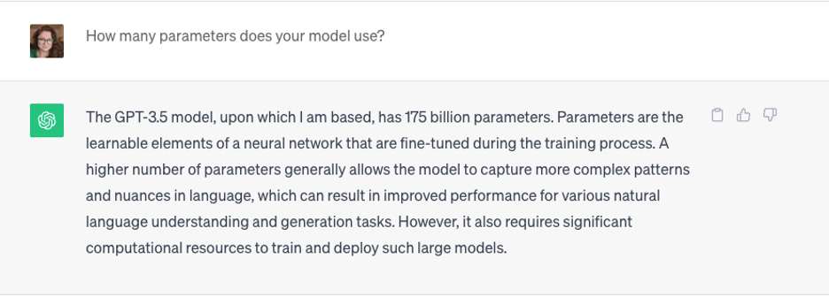 The easiest way to think of parameters is to think of them as factors that control how an AI makes a decision. More parameters = more accuracy. And, just like our other AI terms, the term can be somewhat inconsistently applied. Here’s what ChatGPT has to say for itself:
