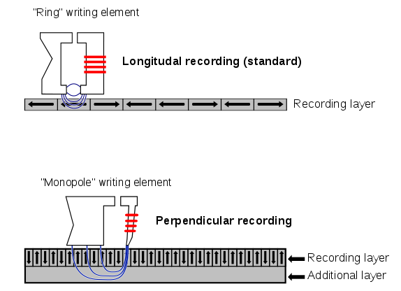 In 2005, the drive industry introduced perpendicular recording technology to replace the older longitudinal recording technology, which enabled areal density to reach more than 100 gigabits per square inch. Longitudinal recording aligns data bits horizontally in relation to the drive’s spinning platter, parallel to the surface of the disk, while perpendicular recording aligns bits vertically, perpendicular to the disk surface.